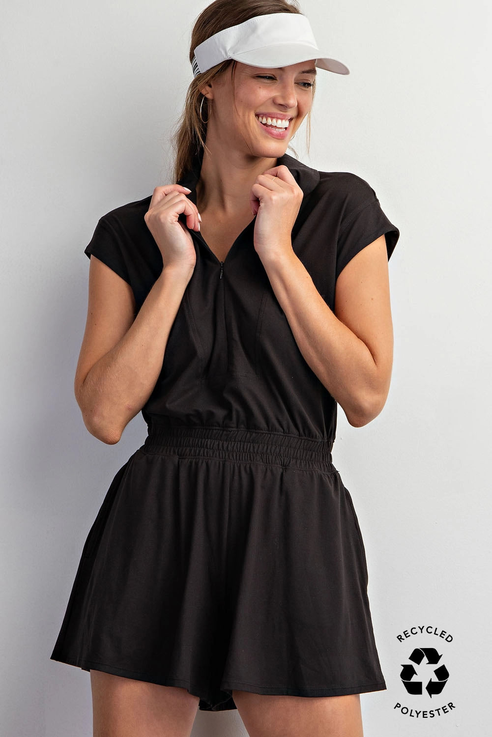 This romper is perfect for all your spring and summer activities, whether you're cheering on your favorite team or just enjoying a day out in the sun. It has a half-zip closure for a modern touch and can be dressed up with flats or dressed down with sneakers. Comfort and fashion come together seamlessly in this buttery soft romper.