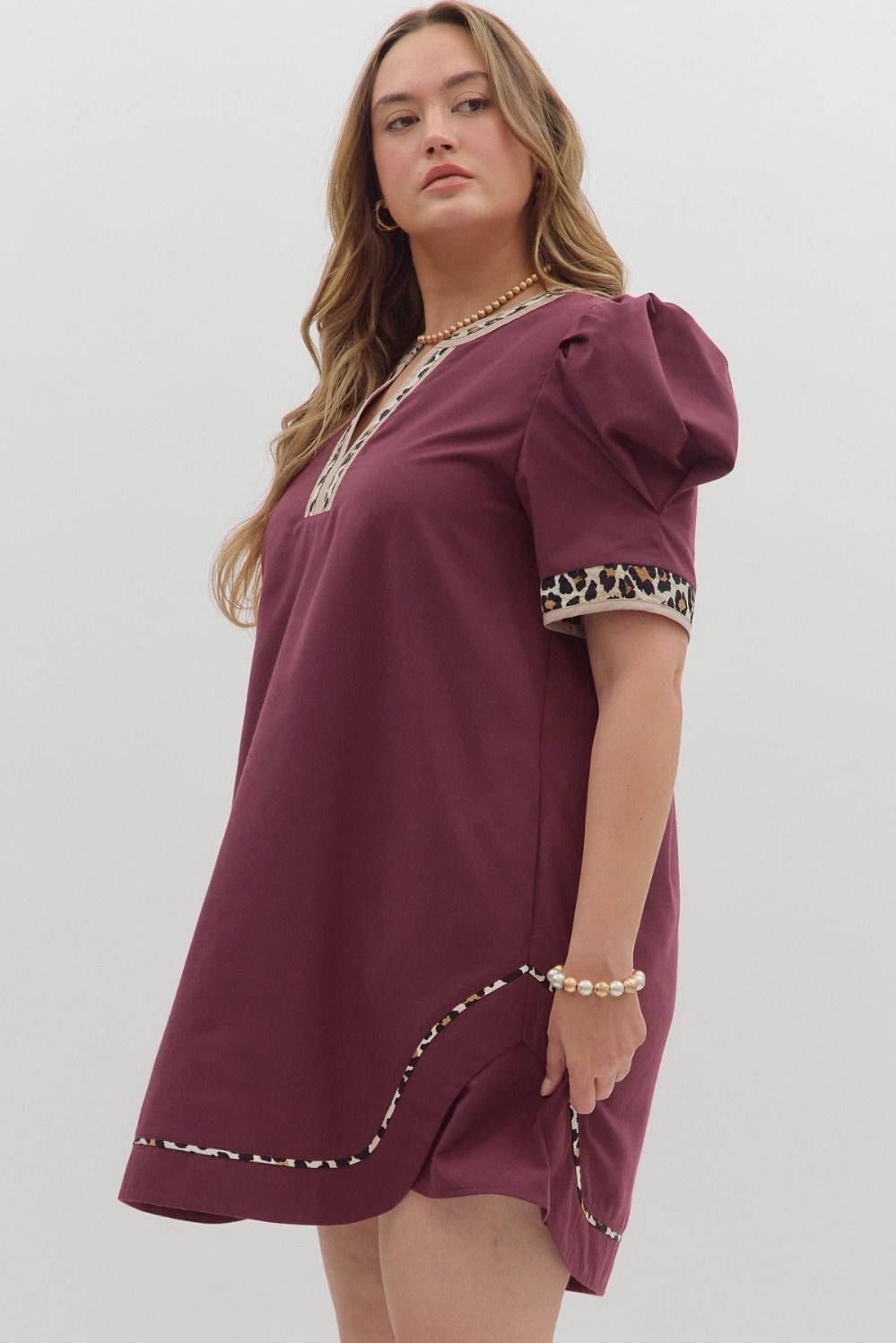 Solid pleated short puff sleeve mini dress featuring animal pattern contrast detail. Side Pockets. Lined. Woven. Non-sheer. Lightweight.