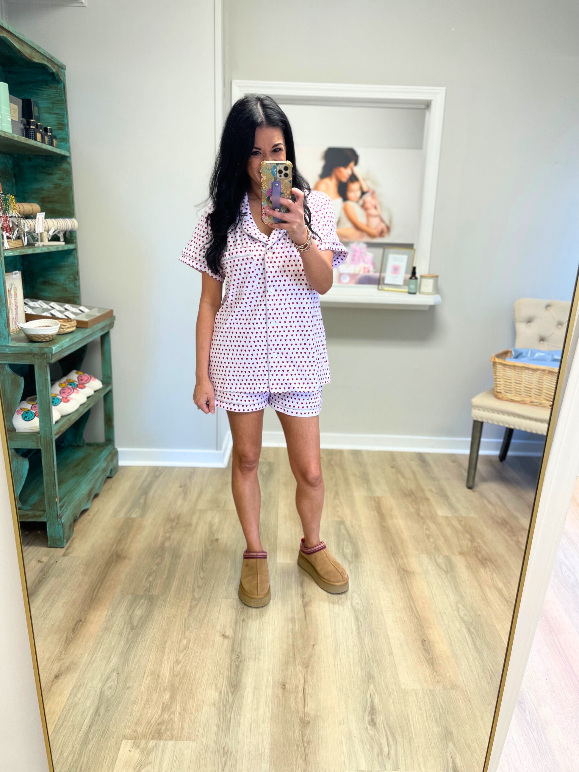 Show your school spirit in the sweetest way! The Varsity Hearts set features a dreamy-soft fabric and bold heart print in team colors — perfect for late-night pep talks, early morning coffee runs, or cheering from the couch. Cozy up and rep your team in style!