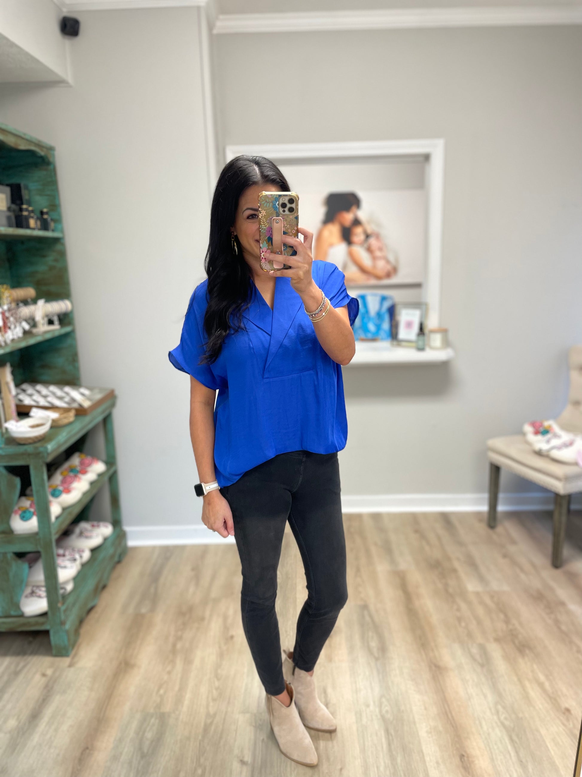 Effortlessly chic and endlessly versatile, the Royal Flow Blouse brings a pop of vibrant style to your wardrobe. Featuring a relaxed silhouette with a flattering V-neckline and flowy short sleeves, this top drapes beautifully for an easy, elevated look.