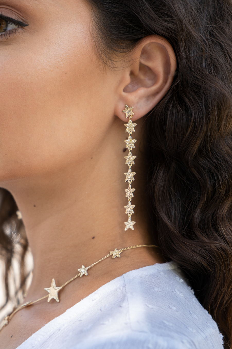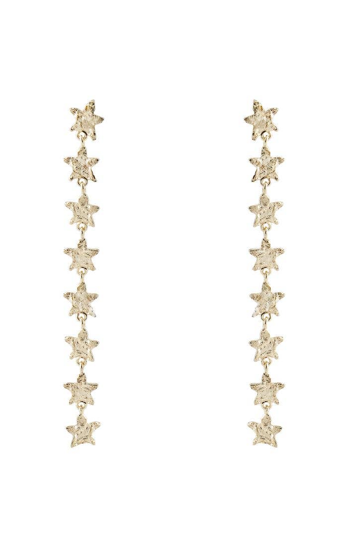 These 18k gold-plated strand earrings feature petite star details and measure 3 inches in length. Their elegant design combines a touch of whimsy with sophisticated style.